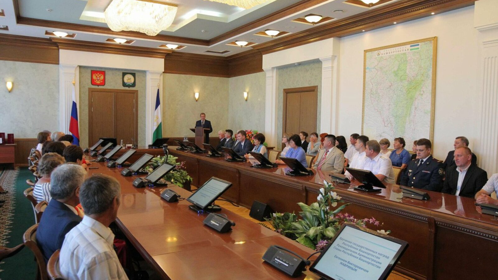 УФА, 5 июл 2018. /ИА «Башинформ», Гульфия Акулова/. В четверг, 5 июля, в Правительстве Республики Башкортостан состоялась церемония вручения государственных наград. Награды и почетные звания лучшим работникам вручил руководитель Администрации Главы Башкортостана Евгений Маврин. От имени Главы республики Рустэма Хамитова он поблагодарил награжденных за добросовестный труд, за их вклад в социально-экономическое развитие региона.