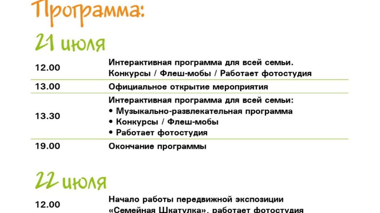 Экспозицию сопровождает развлекательная программа для родителей с детьми - конкурсы с призами, выступления музыкальных коллективов. Каждая семья сможет сделать моментальное фото, которое станет приятным памятным сувениром. Будет также много полезной информации о семейном воспитании от психологов.