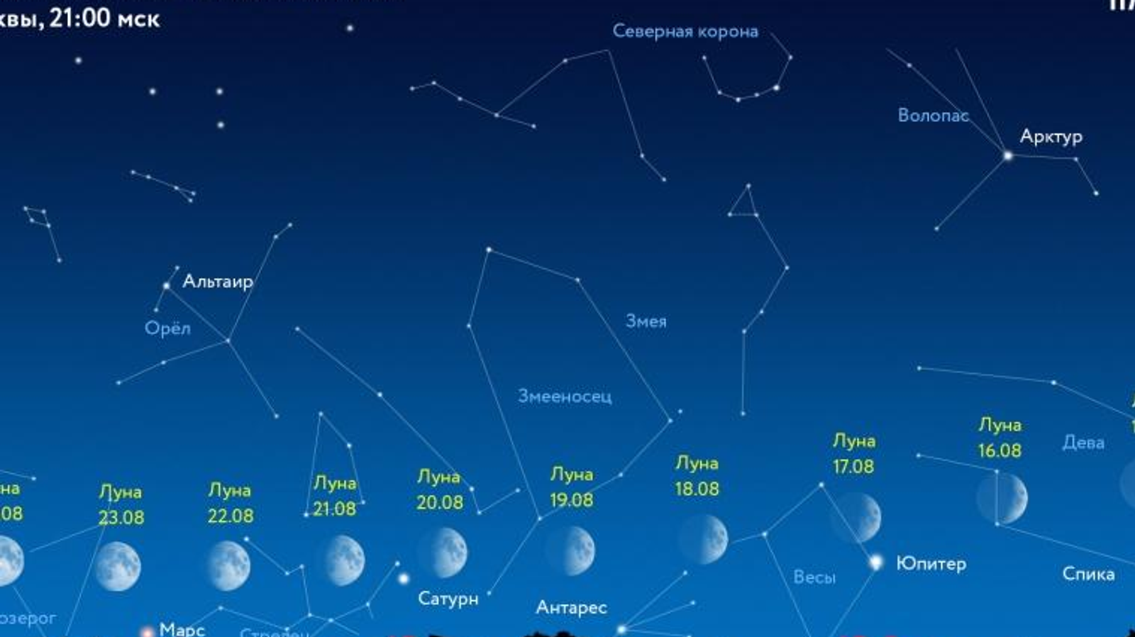21 августа Луна сблизится с Сатурном, 23 августа — с Марсом, 27 августа — с Нептуном, 31 августа — с Ураном. Наблюдать сближение можно будет через час после захода солнца при ясной, безоблачной погоде.