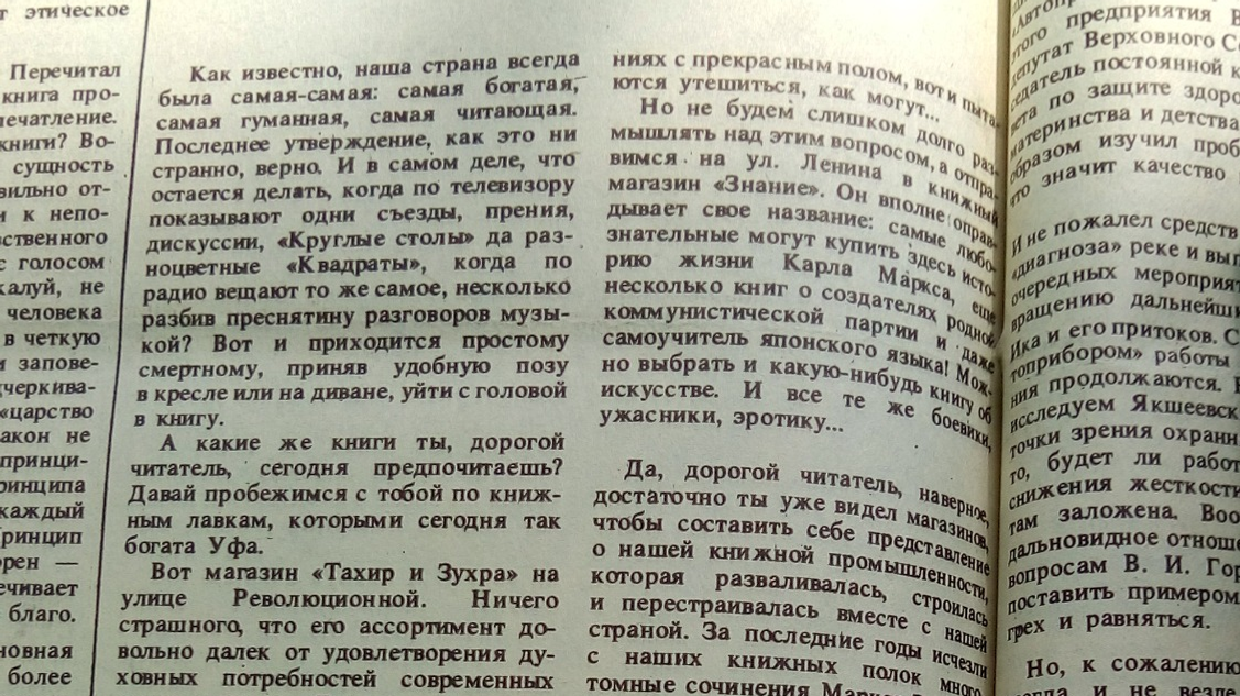 «Наша страна всегда была самая богатая, самая гуманная, самая читающая. Последнее утверждение, как это ни странно, верно», - пишет издание в августе 1993 года, отметив, что, «когда по телевизору одни съезды, прения и дискуссии», только и остается «уйти с головой в книгу». Однако когда корреспондент еженедельника «пробежался» по книжным лавкам Уфы, он ужаснулся.