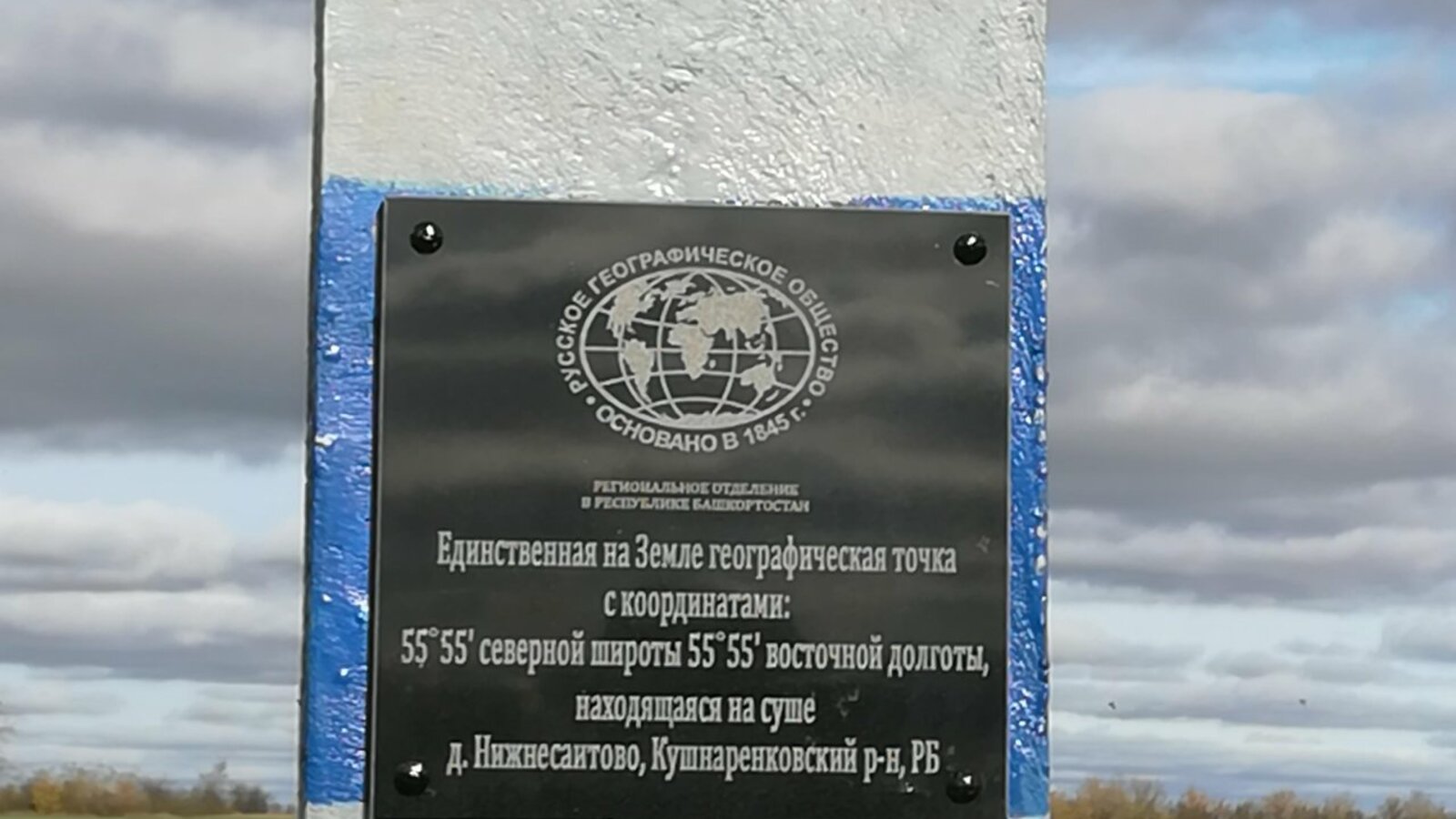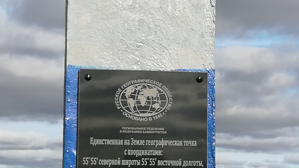Сегодня, 9 октября, у любителей авто-, мото- и вело-туризма, участвующих в проекте, появился еще один объект для посещения - географический знак в виде бело-голубого столба с прикрепленной гранитной табличкой, на которой указаны уникальные географические координаты: 55*55' северной широты 55*55' восточной долготы. Его местонахождение – недалеко от деревни Нижнесаитово в Кушнаренковском районе республики.