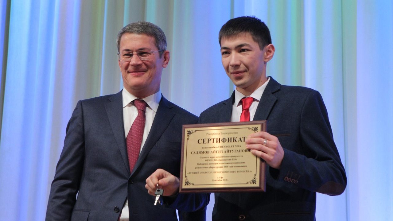 УФА, 31 окт 2018. /ИА «Башинформ», Азат Гиззатуллин/. 10 лучших комбайнеров, водителей, механизаторов аграрного сектора республики сегодня были награждены автомобилями «Шевроле Нива». Они достигли наивысших результатов во время уборочной страды 2018 года. Ключи от автомобилей им вручил врио Главы Башкортостана Радий Хабиров во время торжественного вечера, посвященного Дню работников сельского хозяйства и перерабатывающей промышленности.
