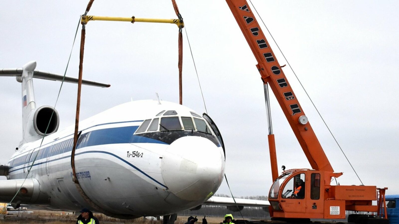 Аварийный борт при помощи трейлера и тягачей отбуксировали на место стоянки.