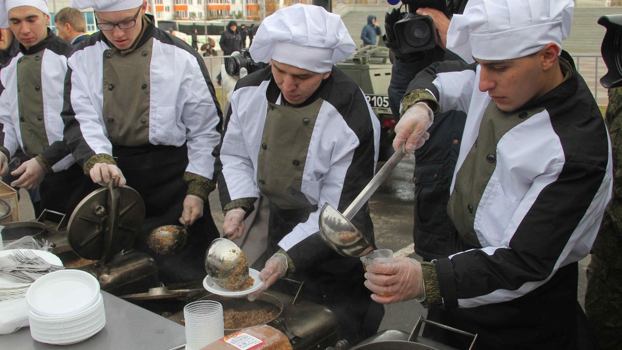 На полевой кухне Радия Хабирова угостили солдатской кашей и горячим чаем.