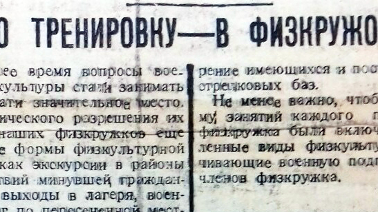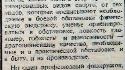 Как отмечается, ни один профсоюзный физкружок не должен забывать своих задач по обороне страны. Также ни один советский физкультурник не мог быть в стороне от военизированных видов спорта, «которые воспитывают необходимые в боевой обстановке физическую выдержку, умение ориентироваться в обстановке, ловкость, глазомер, гибкость и выносливость», говорится в издании.