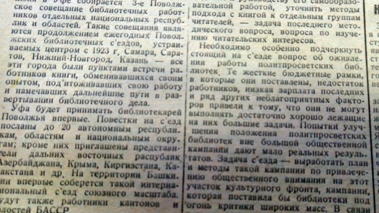 «Культурная революция и, как ее исходная точка - культпоход, культурная пятилетка и социалистическое соревнование - вот те основные моменты, сквозь которые будет преломляться работа съезда Поволжского библиотечного совещания». Об этом информировала газета в день открытия совещания, 7 июня 1929 года. Тогда в Уфе собралось Третье Поволжское совещание библиотечных работников отдельных национальных республик и областей. Задачей съезда было - привлечь внимание к работе библиотек. Особое внимание «этому участку культурного строительства» необходимо было еще и потому, «что в БАССР слишком много недостатков в библиотечной работе», уточняют в издании.