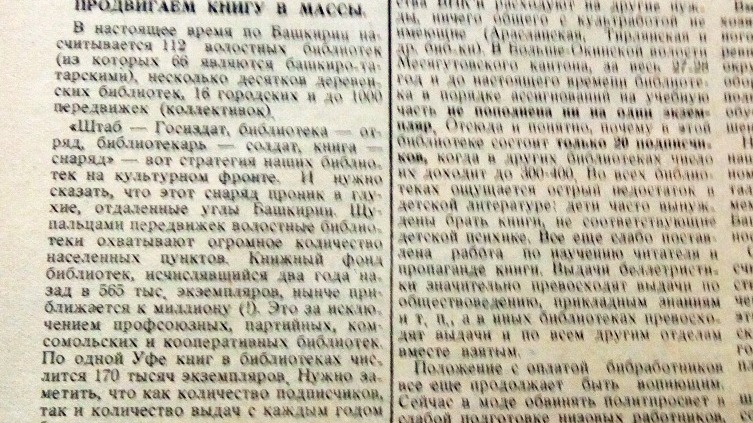 К 1929 году в Башкирии насчитывалось 112 волостных библиотек, из которых «66 являлись башкиро-татарскими, несколько десятков деревенских библиотек, 16 городских и до 1000 передвижек». Так книга проникла в самые глухие уголки республики. Всего за два года фонд библиотек приблизился к миллиону экземпляров. Литература на родном языке в башкиро-татарских библиотеках доходила до 75 процентов по отношению ко всей. При этом быстрое обеспечение библиотек литературой на родном языке упиралось «не столько в средства, сколько в наличие этой литературы». «Разбужен интерес к книге», продолжают в газете, «устанавливаются списочные очереди за книгой».