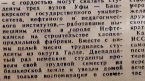 «Двенадцатый раз немецкие студенты провели свой трудовой семестр на башкирской земле», - сообщила газета 11 декабря 1979 года. Вместе со студентами Башкирского государственного университета, нефтяного и педагогического институтов гости из округа Галле целый месяц трудились в Нефтекамске на строительстве хлопкопрядильной фабрики.