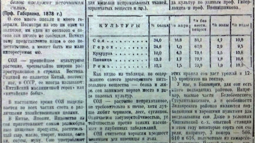 В публикации также говорится, что Чишминская опытная станция вырастила некоторые сорта сои. И, придавая большое значение этой культуре, селекционеры планировали заняться акклиматизацией сои для средней части Башкирии.