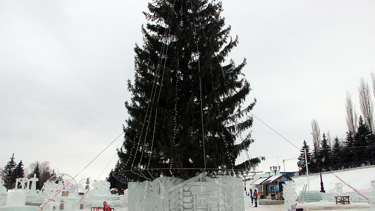 Работы по строительству ледового городка на Дворце спорта подходят к завершению. Хвойную красавицу сюда привезли из Нуримановского района. Вокруг елки расположились три ледяные горки и лабиринт. В этом году в городке построены скульптуры - персонажи сказок. А встречать гостей городка будут символы года – три поросенка Ниф-Ниф, Нуф-Нуф и Наф-Наф. Ледяные блоки, из которых создаются ледовые композиции, привезены с озера Кашкадан.