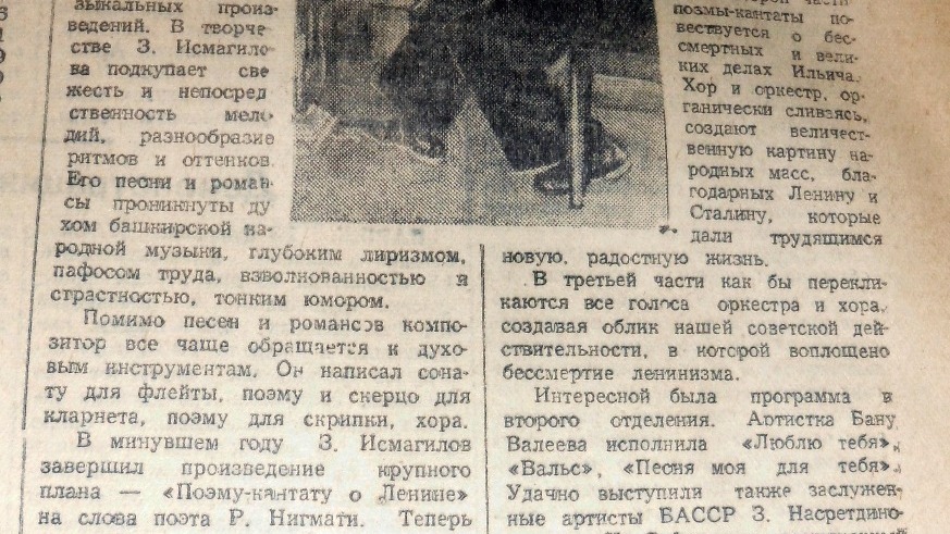 «На днях в Башкирской государственной филармонии состоялся концерт из произведений молодого композитора Загира Исмагилова, посвященный 30-летию Башкирии», - сообщили в газете 15 февраля 1949 года. Как отмечается в публикации, Исмагилов автор многих музыкальных произведений, в его «творчестве подкупает свежесть и непосредственность мелодий». Песни и романсы композитора «проникнуты духом башкирской народной музыки, глубоким лиризмом, взволнованностью и страстностью, тонким юмором».