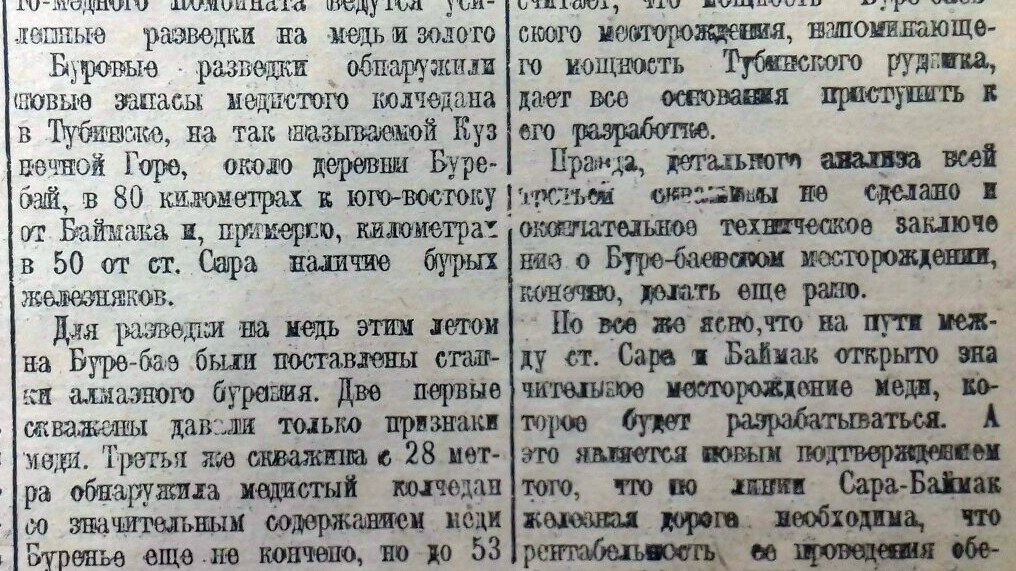 Как сообщается в издании, «буровые разведки обнаружили новые запасы медистого колчедана в Тубинске, на так называемой Кузнечной Горе, около деревни Буребай, в 80 километрах к юго-востоку от Баймака». А в 50 км от станции Сара было зафиксировано наличие бурых железняков.