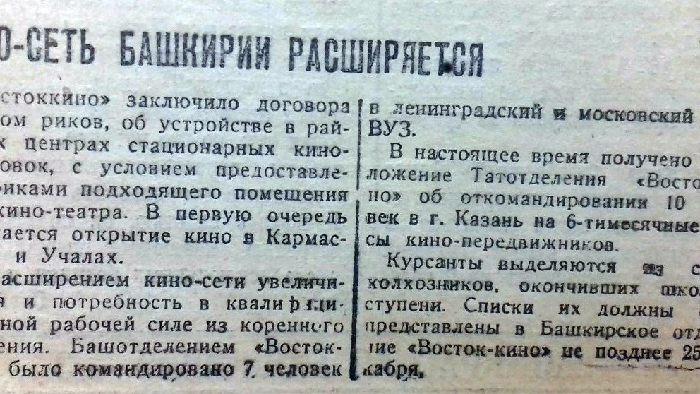 «"Востоккино" заключило договоры с райисполкомами об устройстве в районных центрах стационарных киноустановок, с условием предоставления риками подходящего помещения для кинотеатра», - информировала газета. В первую очередь намечалось открытие кинотеатров в Кармаскалах и Учалах.