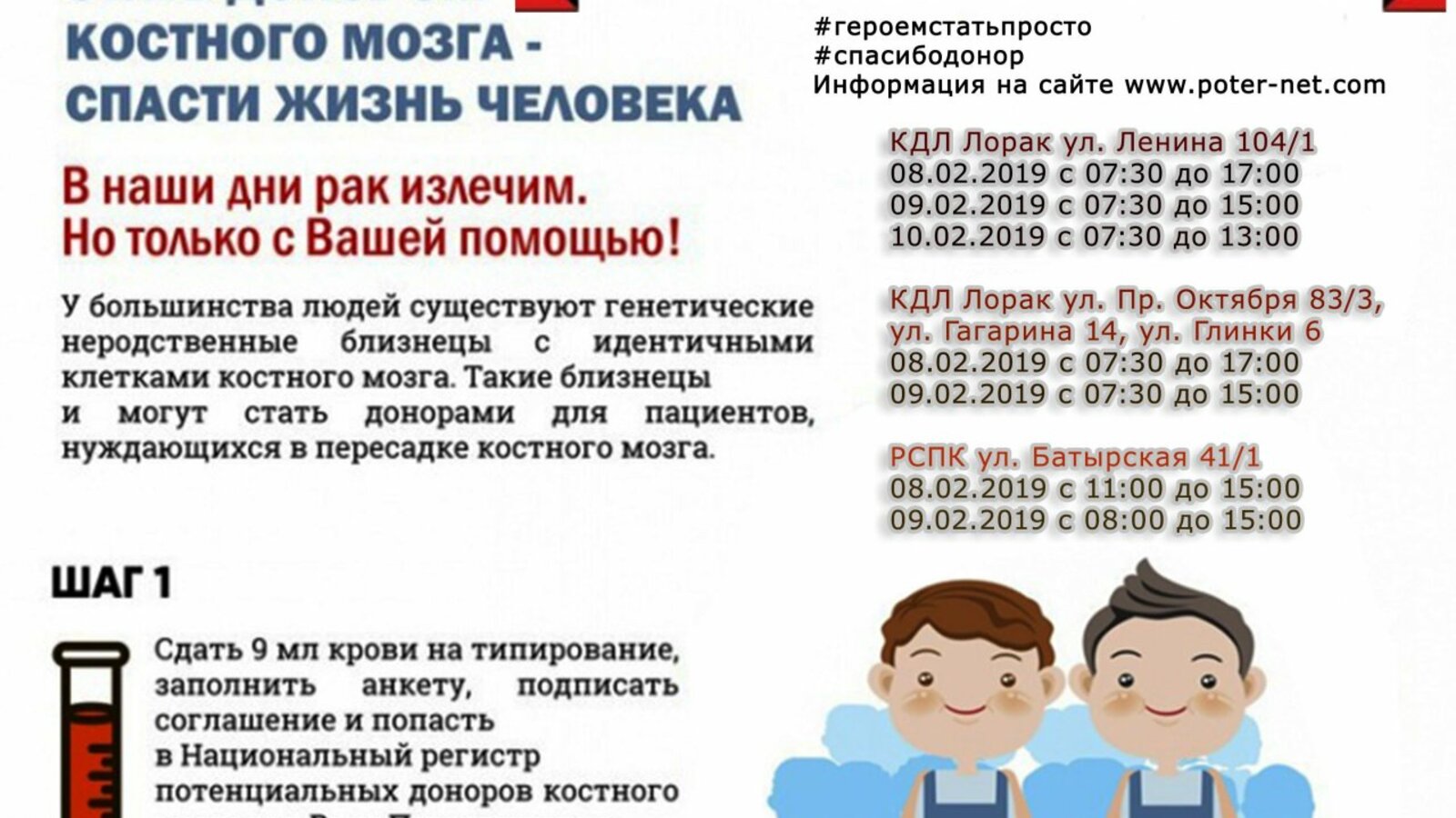 Чтобы стать потенциальным донором костного мозга, нужно сдать кровь на типирование в ближайшем КДК «Лорак» по адресам: ул. Глинки, 6; Проспект Октября, 83/3; ул. Гагарина, 14; ул. Ленина, 104/1, или в Республиканской станции переливания крови (ул. Батырская, 41/1).