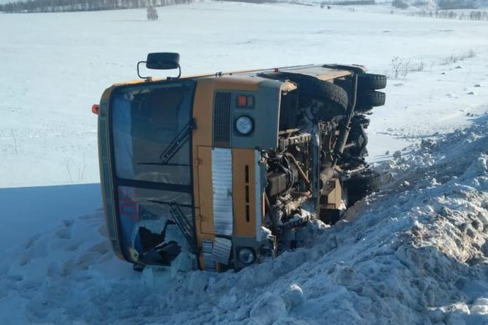 «Во время движения по автодороге у автобуса «закусило» правое колесо и его стащило с дороги — «ПАЗ» лег на бок. То есть когда разгребают снег с магистрали он «кучкуется» по обочине вдоль дороги. Колесо попало в такую кучу снега – это и называется «закусило». Скорость была небольшая, повреждений на автобусе нет – все целое, стекла целые, нет вмятин. Разбито только лобовое стекло. Водитель сам его разбил, чтобы все смогли выбраться наружу», — рассказал агентству Фануз Шаймарданов.