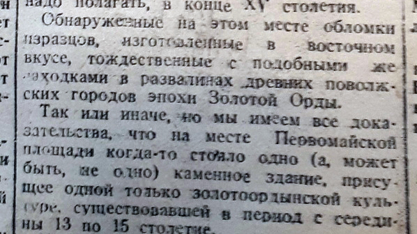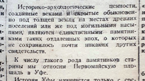 В издании рассказали, что «за последнее время Уфа, в частности, Первомайская площадь, начала понемногу подвергаться исследованиям». Найденный там материал давал основания предполагать, что Уфа стоит «на развалинах другого какого-то древнего, неизвестного нам