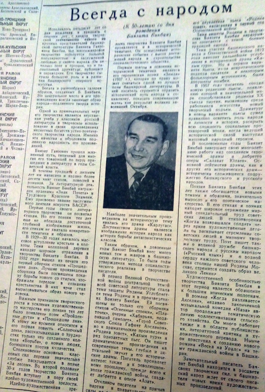 В газете отмечается, что Баязит Бикбай не только поэт и прозаик, но и талантливый драматург, публицист и переводчик, его творчество сыграло большую роль в развитии башкирского оперного искусства.
