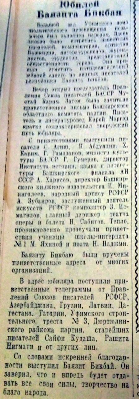 «Большой зал Уфимского дома политического просвещения позавчера был заполнен народом. Здесь можно было встретить известных писателей, композиторов, артистов Башкирии, литературоведов, журналистов, студентов, представителей общественности города. Они пришли отметить пятидесятилетний юбилей одного из видных писателей республики Баязита Бикбая», - написала газета 11 января 1959 года. Юбилейный вечер открыл председатель правления Союза писателей БАССР Мустай Карим. С приветствиями выступили министр культуры республики Гали Гумеров, писатель Сагит Агиш, композитор Загир Исмагилов, главный дирижер театра оперы и балета Нариман Сабитов, рассказали в издании.