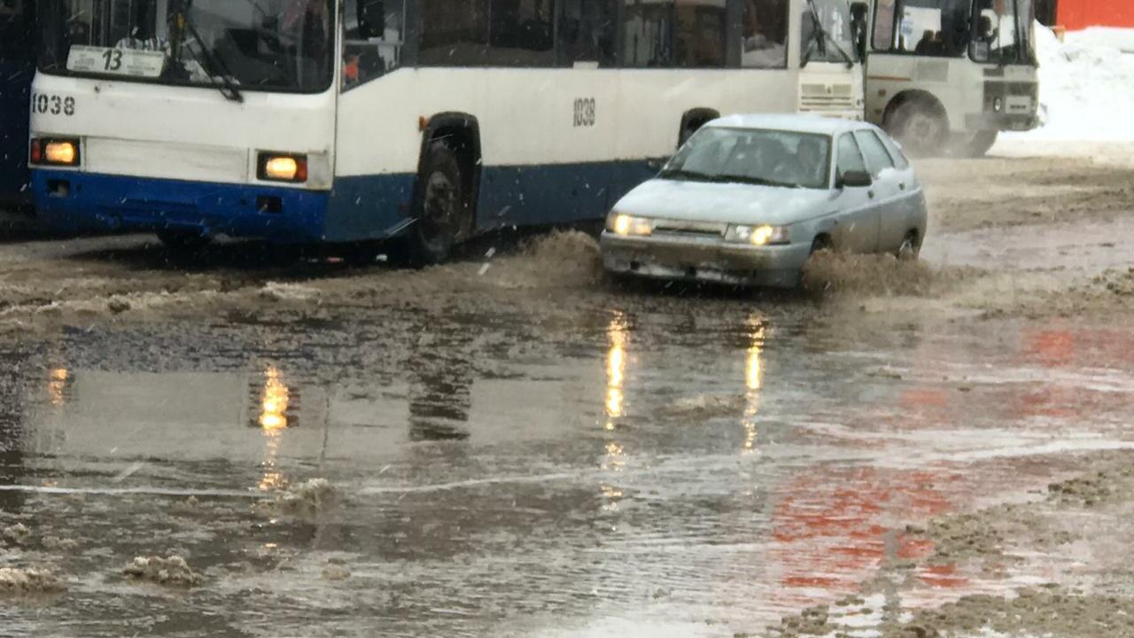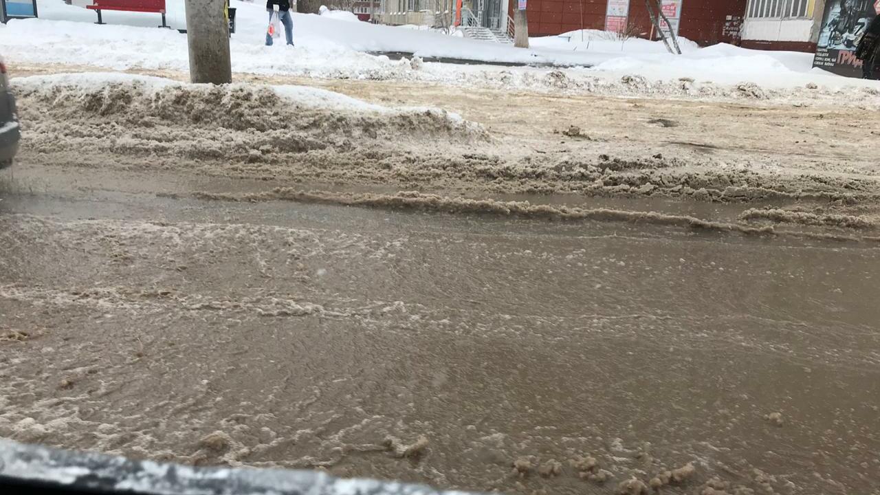 УФА, 9 фев 2019. /ИА «Башинформ»/.В субботу проезжая часть на улице Авроры напомнила местным жителям о приближении весны. Дорога превратилась в одну большую реку, которую с трудом преодолевали как пешеходы, так и автомобилисты.