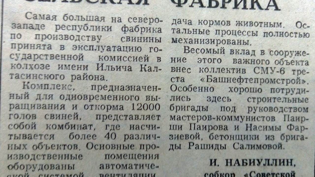 «Самая большая на северо-западе республики фабрика по производству свинины принята в эксплуатацию государственной комиссией в колхозе имени Ильича Калтасинского района», - сообщают в газете.