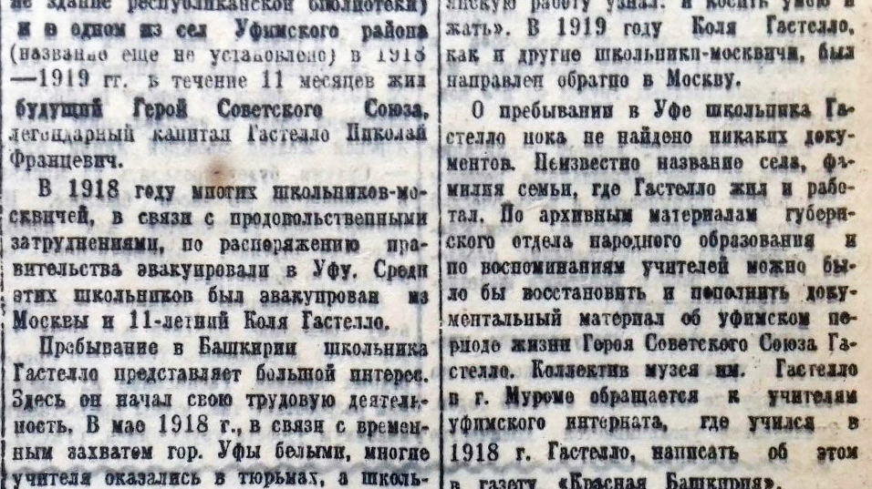 «Неизвестно название села, фамилия семьи, где Гастелло жил и работал», - сетуют в издании и предлагают «по архивным материалам губернского отдела народного образования и по воспоминаниям учителей восстановить и пополнить документальный материал об уфимском периоде жизни Героя Советского Союза Гастелло». В мае 1946 года с такой просьбой к учителям уфимского интерната, где учился Гастелло, обратились сотрудники музея имени Н. Гастелло в городе Муроме.