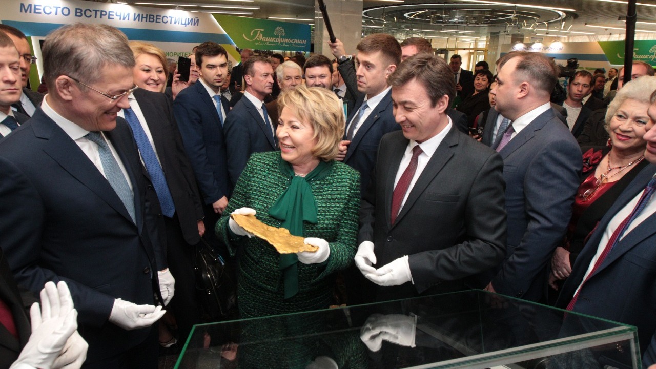Высокие гости ознакомились с выставкой сарматского золота (часть экспонатов на один день под охраной была привезена в ГКЗ). Радий Хабиров на выставке рассказал Валентине Матвиенко о планах развития региона на ближайшие годы в рамках реализации национальных проектов.