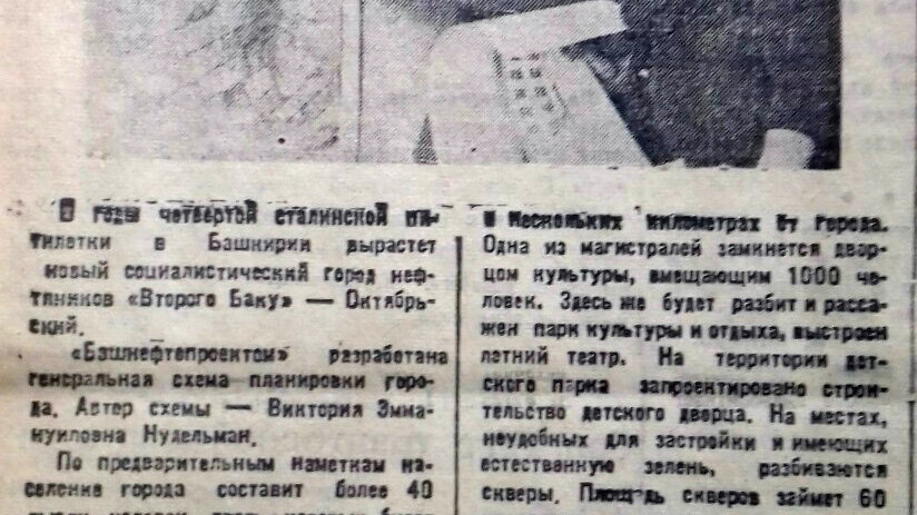 «В годы четвертой сталинской пятилетки в Башкирии вырастет новый социалистический город нефтяников «Второго Баку» - Октябрьский», - информировала газета 1 мая 1946 года. Генеральную схему планировки города разработал «Башнефтепроект». Автором схемы была главный архитектор этой проектно-сметной госконторы Виктория Нудельман.