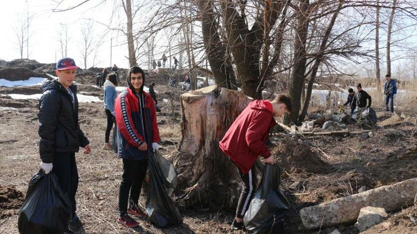 УФА, 6 апр 2019. /ИА «Башинформ», Гульфия Акулова/. В микрорайоне Сипайлово на пересечении улиц Максима Рыльского и Набережной реки Уфы в рамках субботника проходит масштабная экологическая акция «Чисто! Модно! Молодежно!».