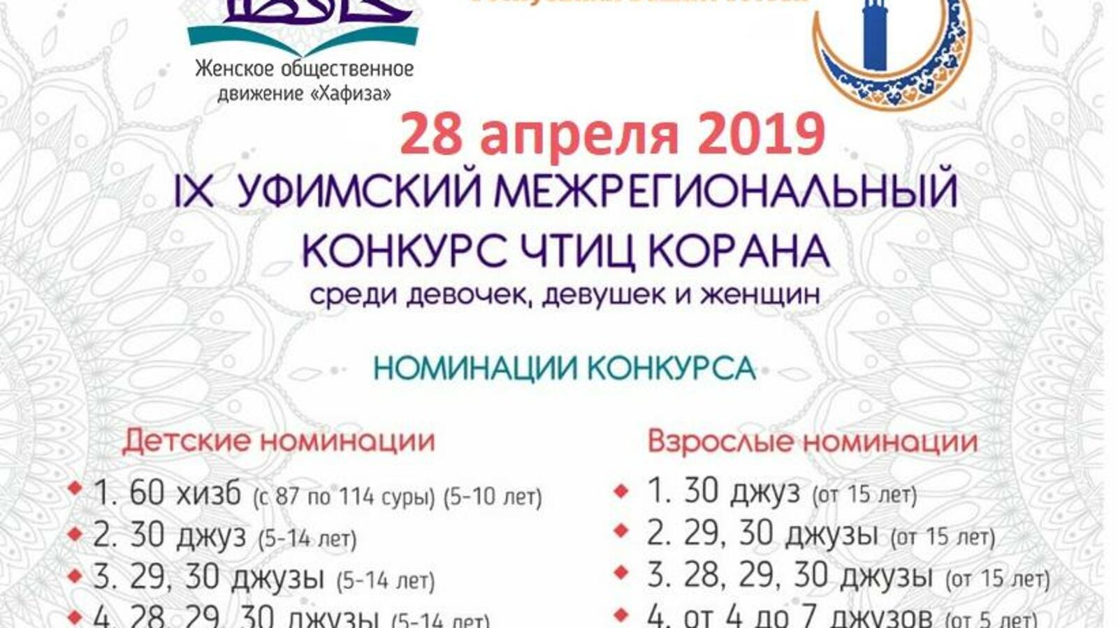 УФА, 15 апр 2019. /ИА «Башинформ», Гульфия Акулова/. 27-28 апреля в Уфе состоится ежегодный межрегиональный конкурс чтецов Корана. Его организует женское общественное движение «Хафиза» при содействии Духовного управления мусульман Башкортостана. Для участия в конкурсе приглашаются представительницы прекрасного пола, как дети, так и взрослые.