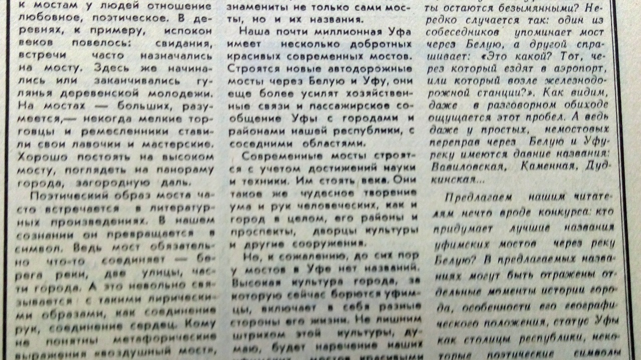 «Высокая культура города включает в себя разные стороны его жизни. Не лишним штрихом этой культуры будет наречение наших уфимских мостов красивыми звучными названиями», - предложил в газете бывший работник Уфимского мостостроительного управления № 17.