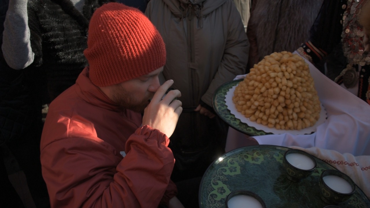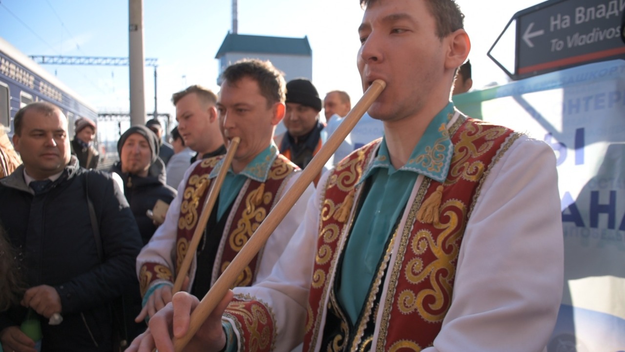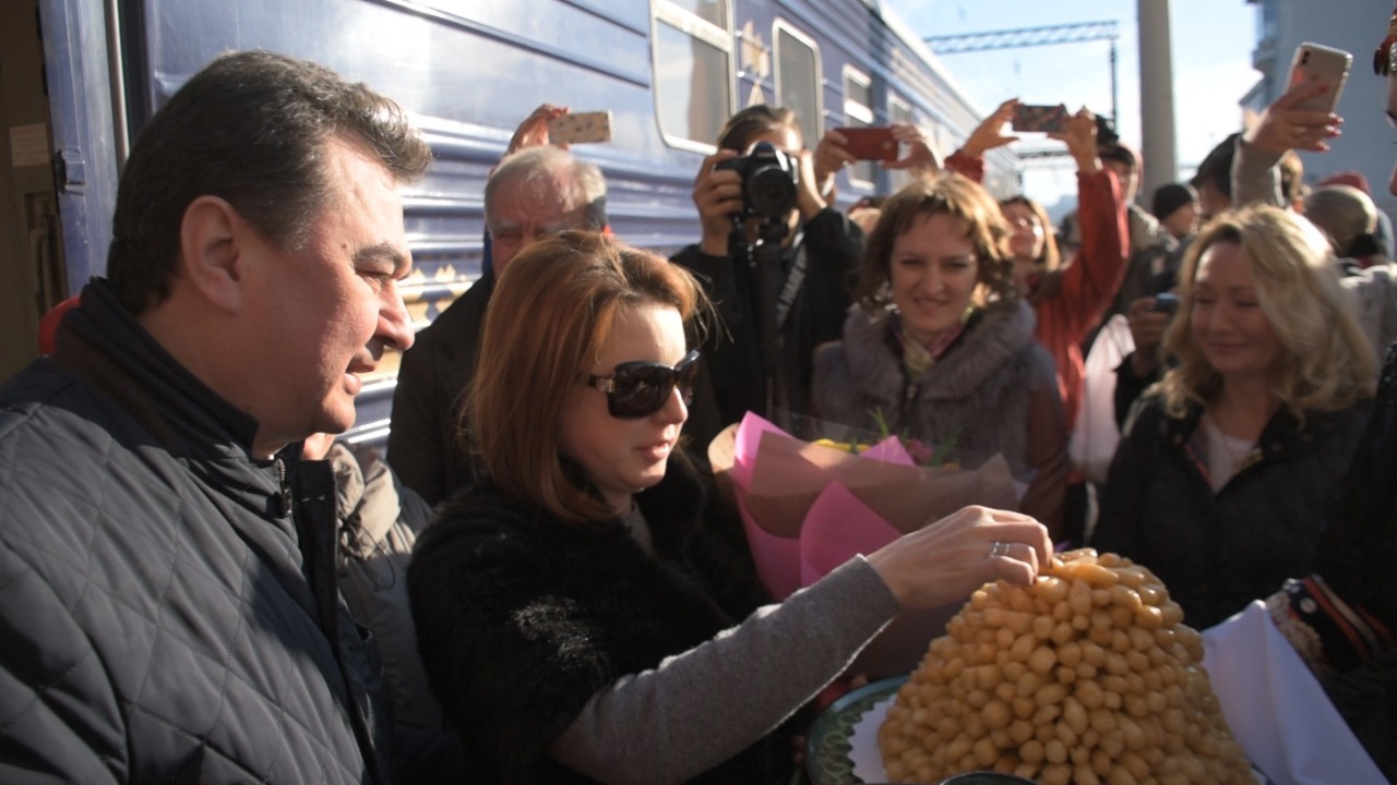 Выйдя из поезда, Ирина Слуцкая получила цветы от замминистра молодежной политики и спорта Башкирии Павла Муслимова, угостилась чак-чаком и кумысом, а также попросила угостить башкирскими сладостями всех желающих.