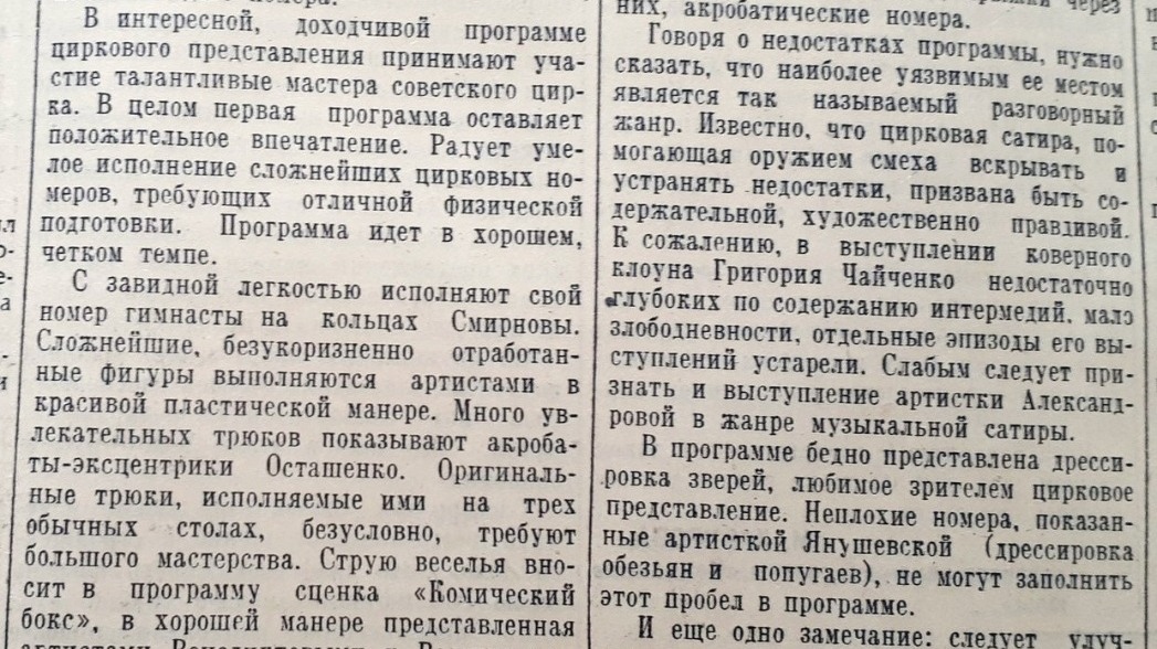 Уфимском государственном цирке были включены два массовых номера, отмеченные масштабностью и красочностью. Велофигуристы под руководством В. Асмус показывали виртуозную езду на двухколесных и одноколесных велосипедах, сопровождаемую акробатикой и жонглированием. Акробаты под руководством заслуженного артиста РСФСР В. Янушевского мастерски демонстрировали джигитовку на верблюдах, прыжки через них и акробатические номера.