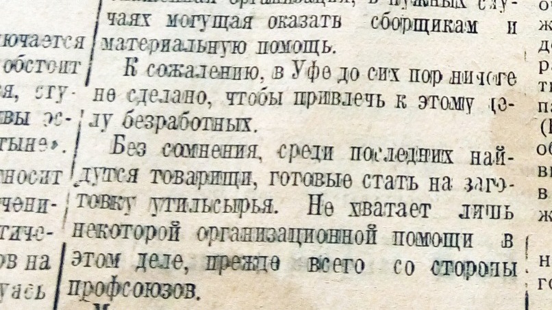 В издании напомнили, что ранее «Наркомторг РСФСР обратил внимание органов Наркомтруда на возможность использования труда безработных при сборе утильсырья. Но, к сожалению, в Уфе до сих пор ничего не сделано, чтобы привлечь к этому делу безработных», сетует автор публикации.