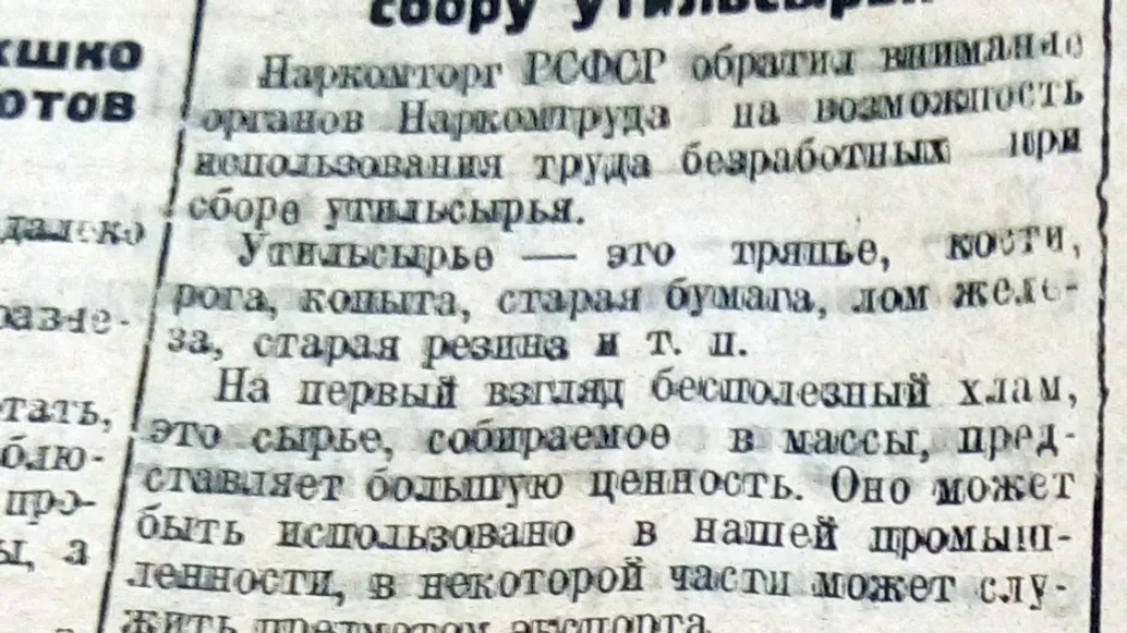 «Утильсырье – тряпье, кости, рога, копыта, старая бумага, лом железа, старая резина - на первый взгляд, бесполезный хлам, но собранное в массу - это сырье, которое представляет большую ценность. Оно может быть использовано в промышленности и в некоторой части может служить предметом экспорта», - пишут в газете и отмечают, что при этом в республике «громадные массы утильсырья пропадают совершенно даром».