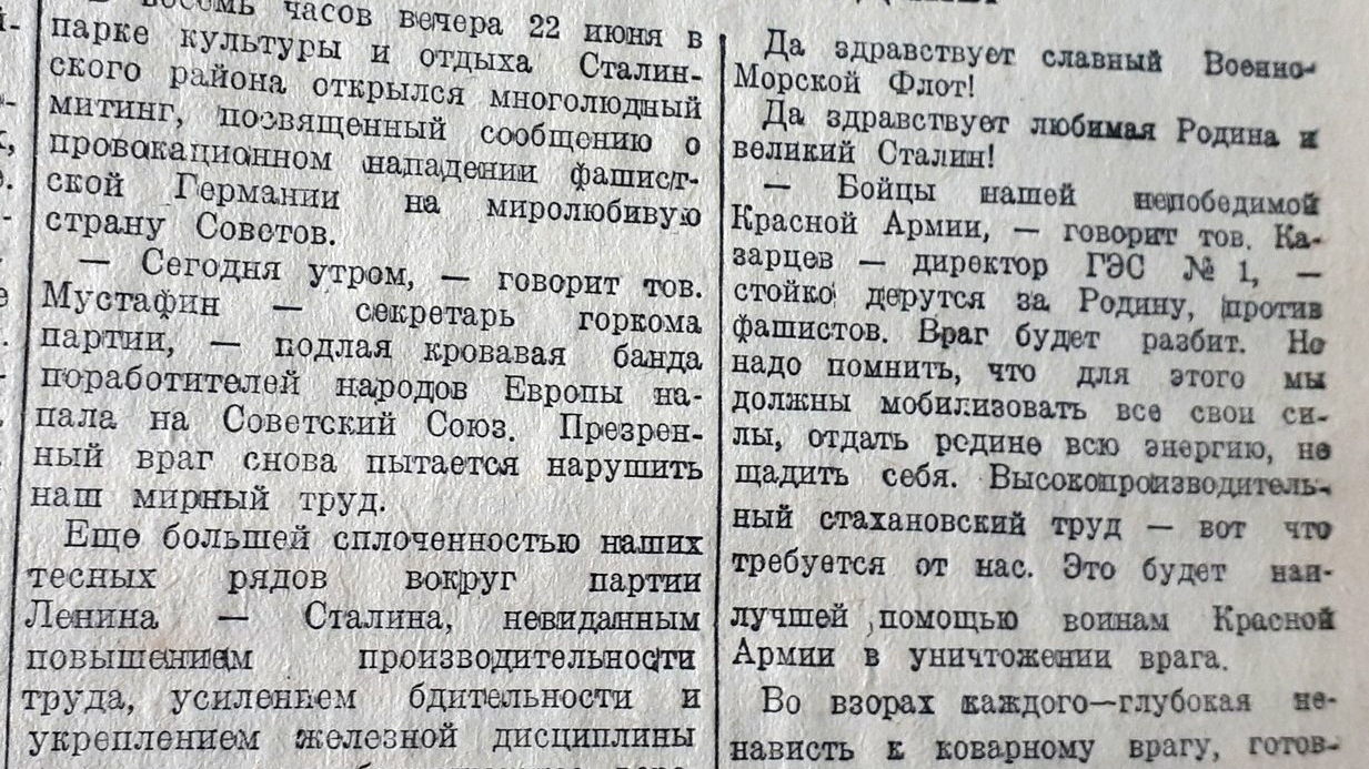 В восемь часов вечера 22 июня в парке культуры и отдыха Сталинского района Уфы открылся многолюдный митинг, посвященный сообщению о провокационном нападении фашистской Германии на страну Советов. «Сегодня утром подлая кровавая банда поработителей народов Европы напала на Советский Союз, - обратился к собравшимся секретарь горкома партии Мустафин. – Еще большей сплоченностью наших тесных рядов вокруг партии Ленина-Сталина, невиданным повышением производительности труда, усилением бдительности и укреплением железной дисциплины ответим на это беспримерное вероломство зазнавшихся правителей Германии», - призвал он.