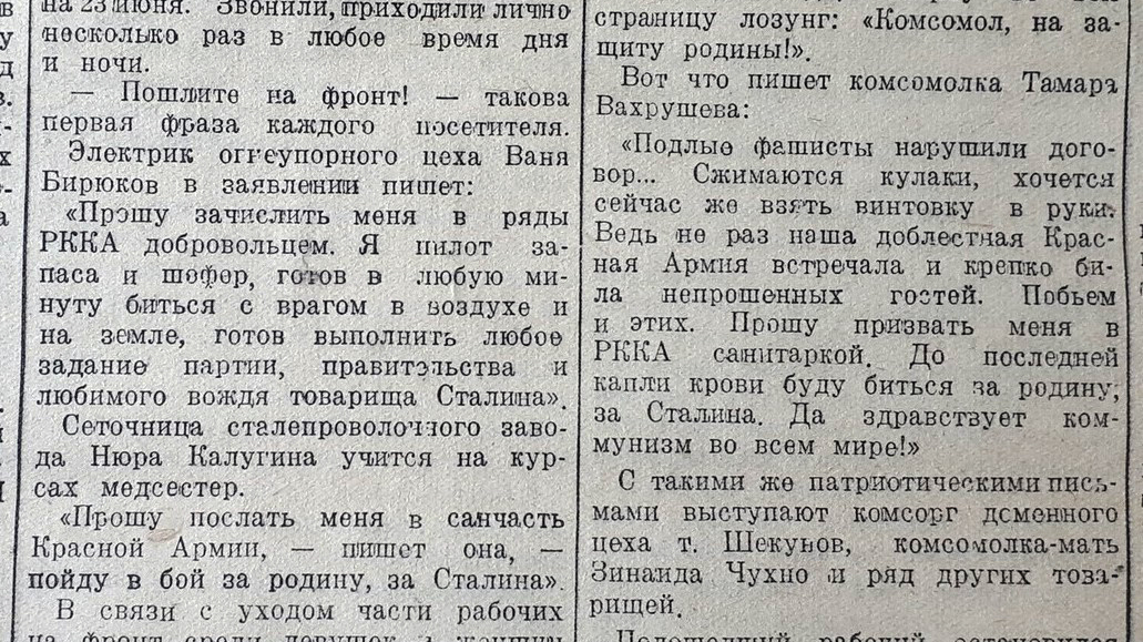 «Подлые фашисты нарушили договор... Сжимаются кулаки, хочется сейчас же взять винтовку в руки... Прошу призвать меня в РККА санитаркой. До последней капли крови буду биться за родину, за Сталина», - написала в комсомолка Тамара Вахрушева. С такими же патриотическими письмами выступали комсорг доменного цеха Шекунов, комсомолка Зинаида Чухно и многие другие.