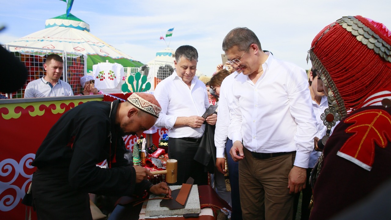 Руководитель Башкортостана Радий Хабиров, которого по традиции встретили хлебом-солью, возложил цветы к подножию горы Торатау, ознакомился с выставкой изделий прикладного искусства.