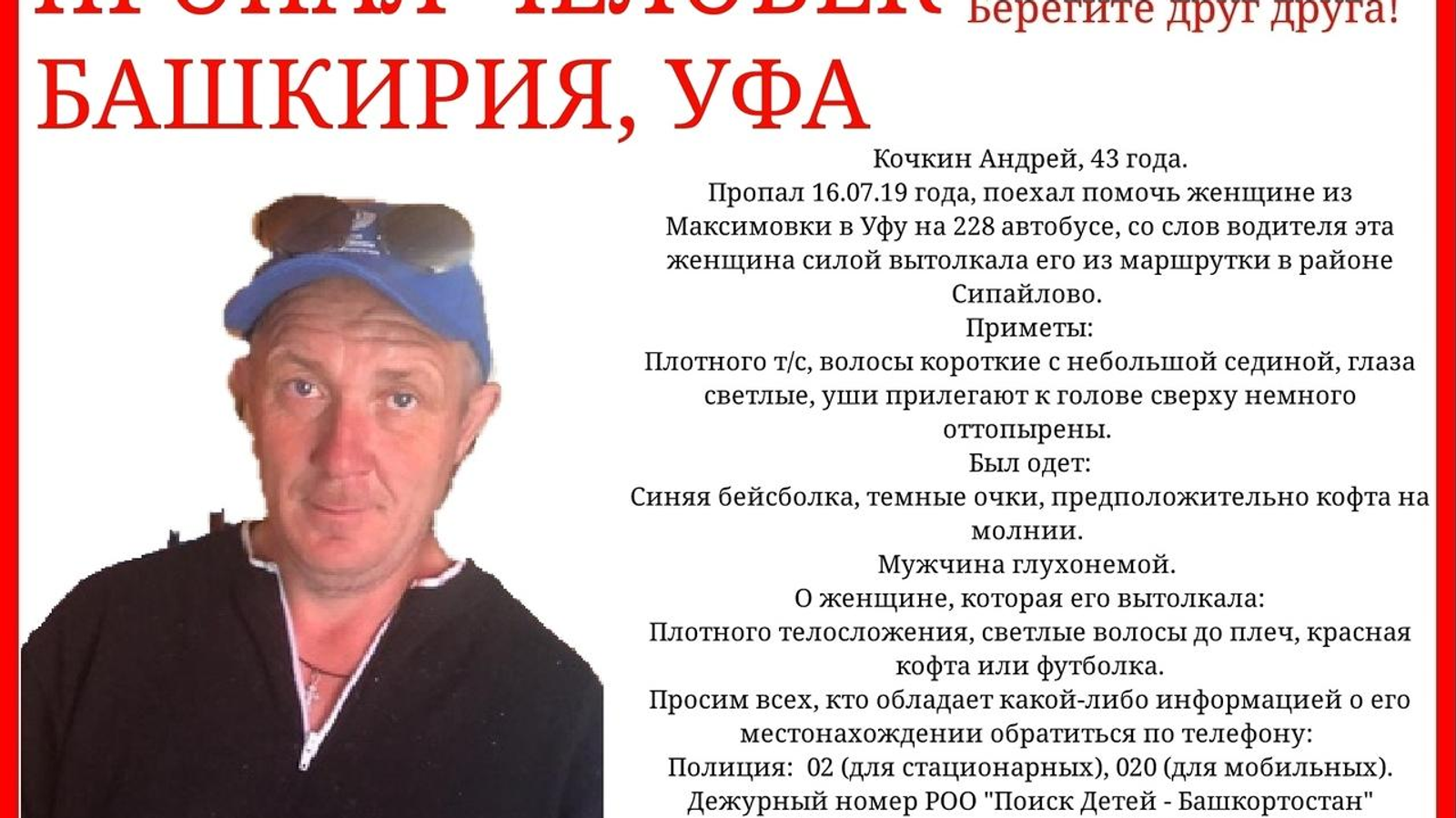 УФА, 16 июл 2019. /ИА «Башинформ»/.В Уфе ищут пропавшего без вести 43-летнего Андрея Кочкина. Мужчина инвалид – не разговаривает. Это сын бабы Тони из Максимовки, которая стала известна после поста в социальных сетях о том, что она голодает и «есть одуванчики».