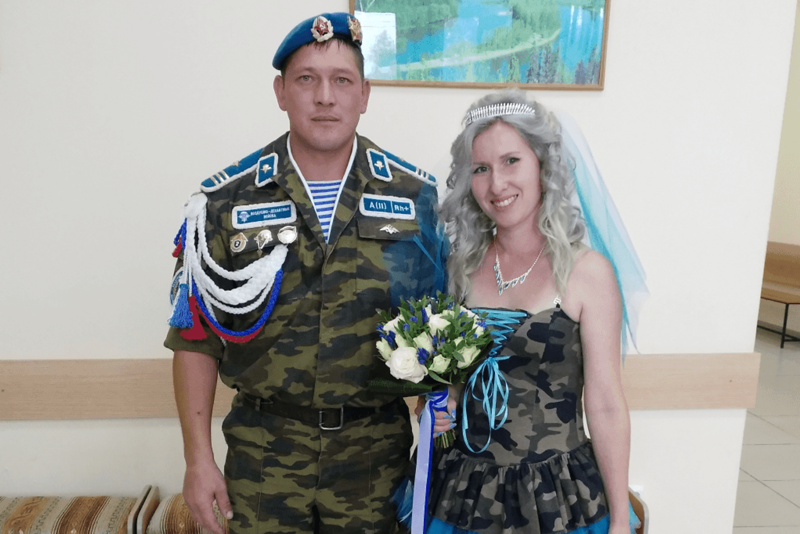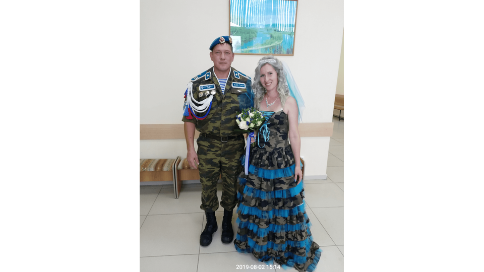 Она — в платье в стиле милитари с голубой фатой, а жених — в парадной форме десантных войск. Руслан до свадьбы проходил службу по призыву в Воздушно-десантных войсках России, и именно поэтому решил сыграть стилизованную свадьбу в праздничный день. Теперь для молодоженов 2 августа не просто день ВДВ, а семейный праздник.