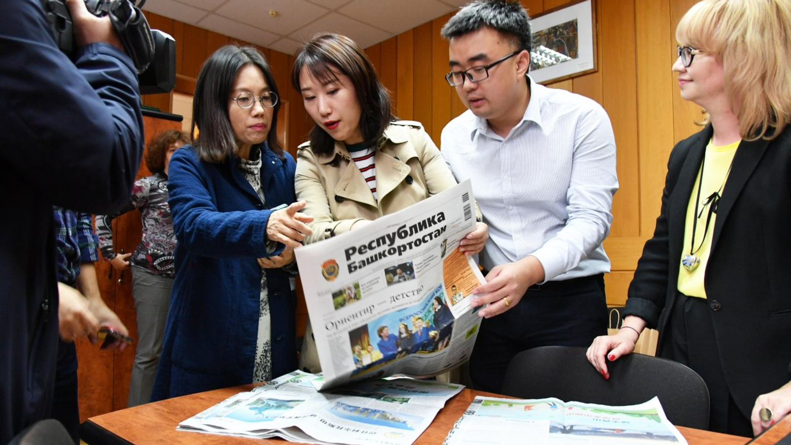 Группа китайских телевизионщиков снимает репортаж об Уфе в рамках формата «Волга-Янцзы»