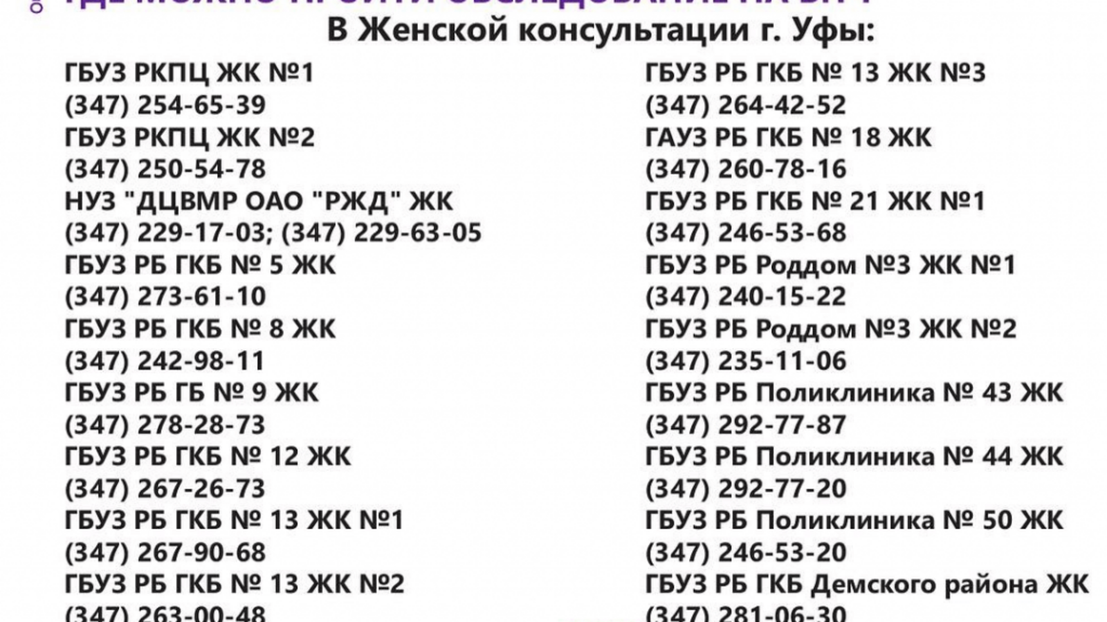 УФА, 6 авг 2019. /ИА «Башинформ»/. В женских консультациях Уфы стартовала бесплатная акция по обследованию на вирус папилломы человека. В ней могут участвовать женщины в возрасте от 30 до 39 лет, имеющие медицинский полис. Об этом сообщили в Минздраве Башкирии.