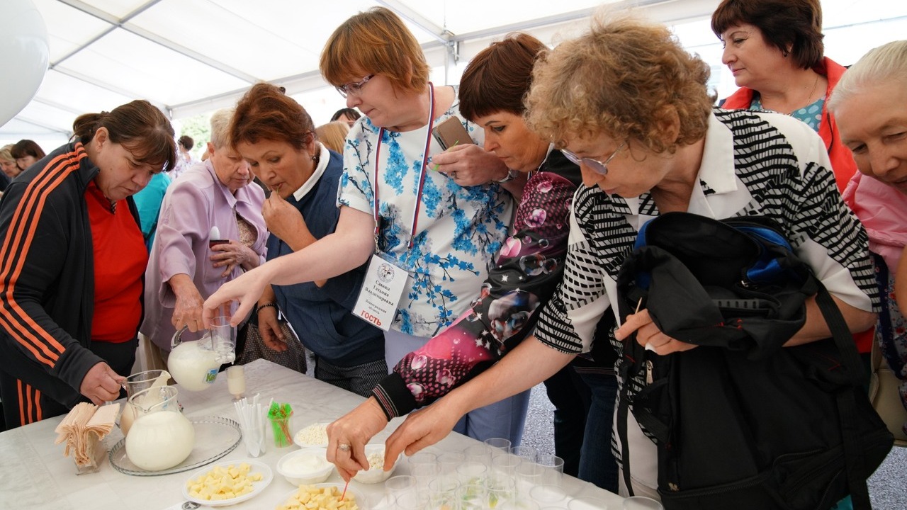 Справка. На молочной ярмарке фестиваля «Молочная страна-2018» гости приобрели 46 тонн цельномолочной продукции, 4,9 т. — масла сливочного, 2 т. — сыров твердых, 1,2 т. — сыров мягких и сырных продуктов, 1,9 т. — мороженого, 4,4 т. — кумыса, 17 тыс. 550 банок — молока сгущенного, 700 литров — козьего молока. Общая выручка молочной ярмарки составила 7 млн рублей.