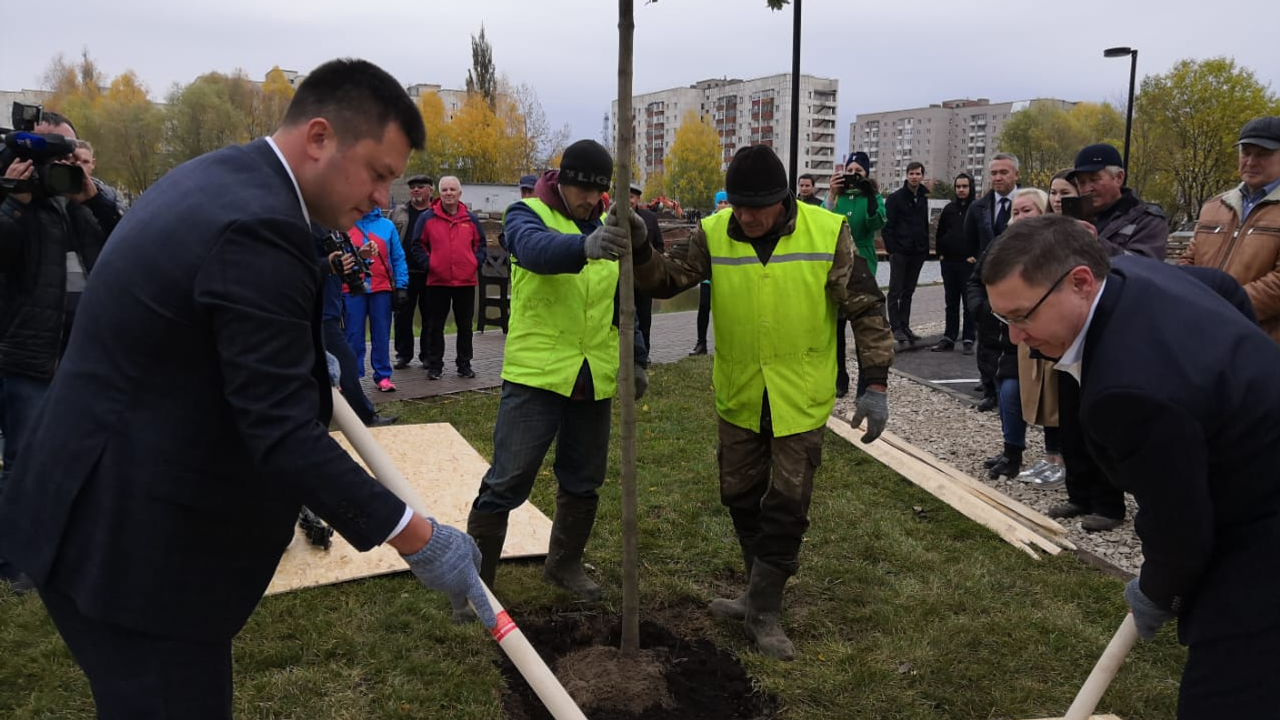 УФА, 3 окт 2019. /ИА «Башинформ», Азат Гиззатуллин/. Министр строительства и ЖКХ России Владимир Якушев и глава Башкортостана Радий Хабиров сегодня в Нефтекамске посадили клены на новой аллее, вокруг озера Светлое.