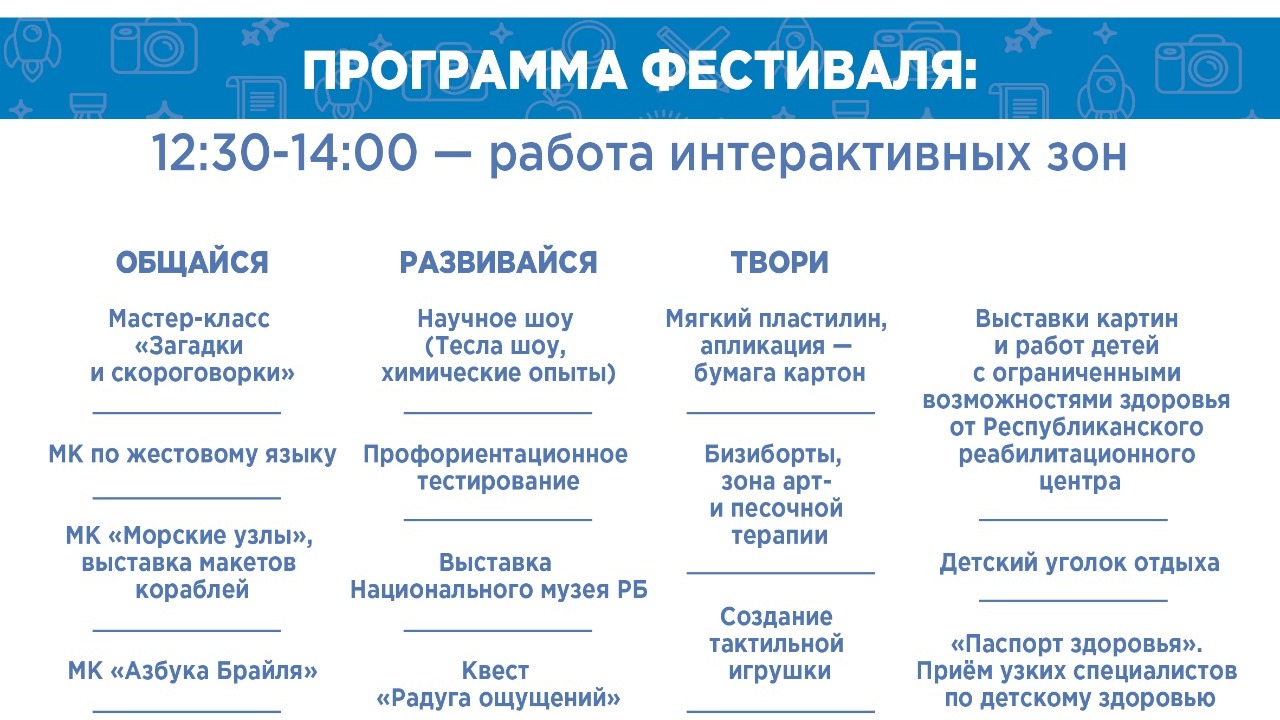 Также будет представлена зона «Паспорт здоровья» — две большие площадки с приемом специалистов по детскому здоровью и занимательным квестом. Бесплатные приемы проведут пять врачей из РДКБ — аллерголог, ортопед, гастроэнтеролог, психолог, невролог.
