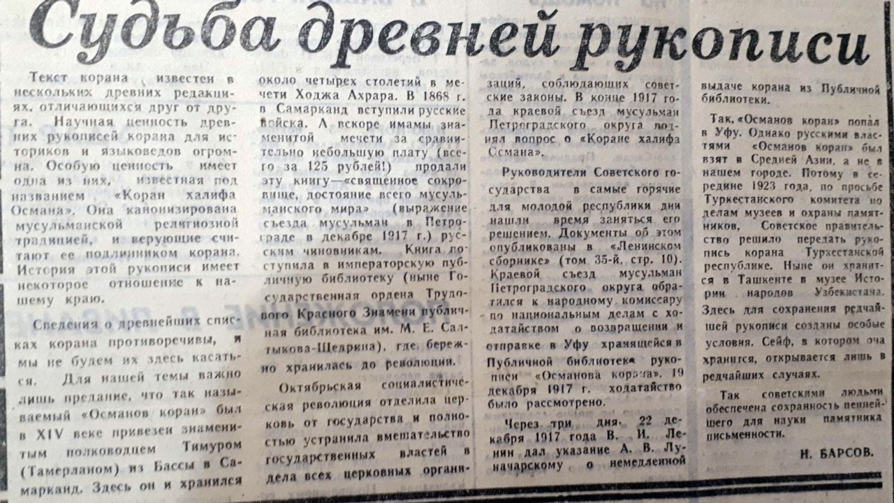 Научная ценность древних рукописей корана для историков и языковедов огромна, пишут в газете и отмечают, что «особую ценность имеет одна из них, известная под названием “Коран халифа Османа”. Она канонизирована мусульманской религиозной традицией, и верующие считают ее подлинником корана». Издание выяснило, что история этой рукописи имеет отношение к Башкирии.