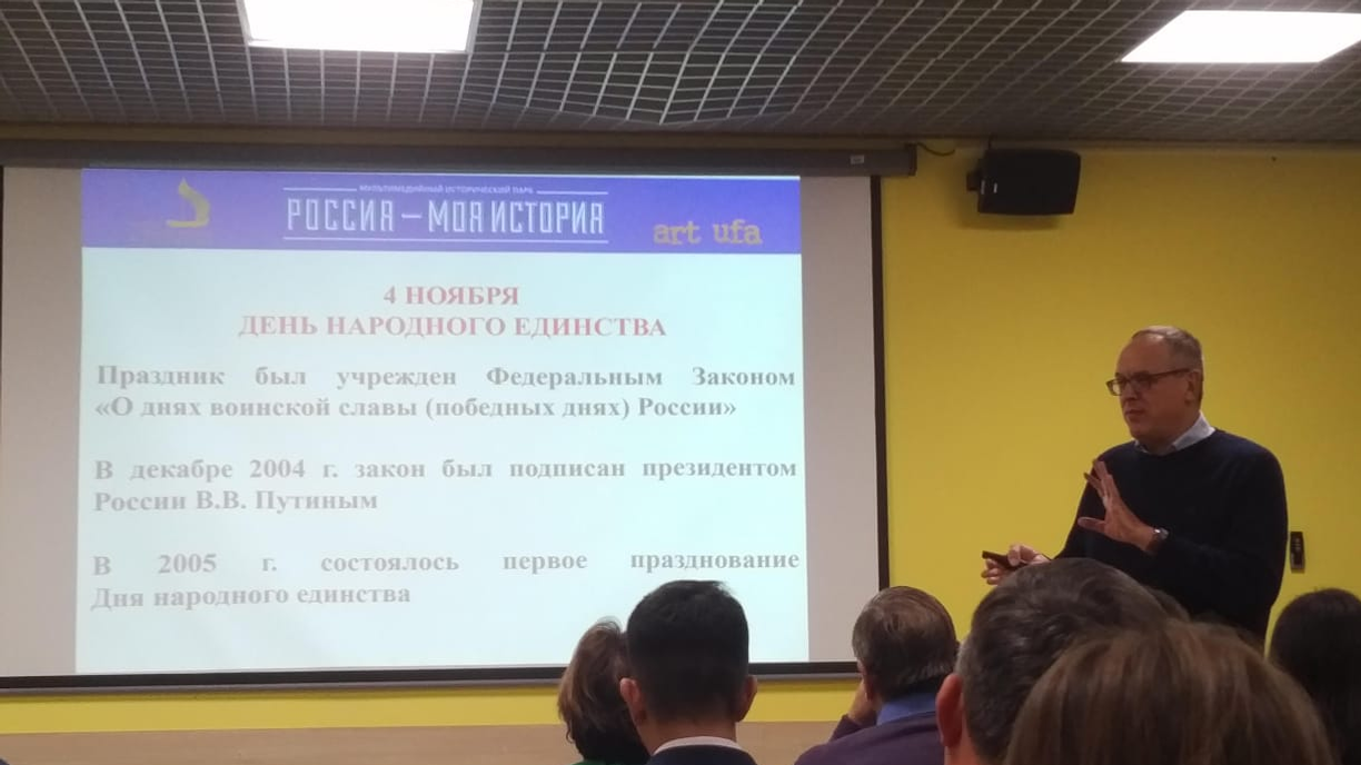 «О том, что такое дружба народов в нашей республике, хорошо сказал Радий Фаритович Хабиров на форуме «Валдай». Это отнюдь не толерантность, английский термин, когда люди терпят друг друга. Дружба народов – это когда люди действительно живут друг с другом в мире и согласии. Доказательством тому является то, что каждый третий брак в республике – межнациональный».Председатель Регионального отделения «Российское военно-историческое общество» в РБ, член-корреспондент Академии военных наук Рамиль Рахимов выступил с докладом «Новое прочтение Дня народного единства» и рассказал о празднике в современных условиях.