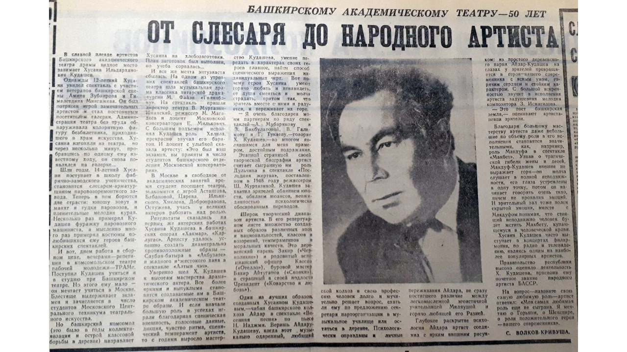 УФА, 5 ноя 2019. /ИА «Башинформ»/. Несколько раз примерял Хусаин Кудашев фуражку машиниста, а мысленно много раз примерял костюмы героев башкирских спектаклей. О борьбе двух страстей в будущем народном артисте поведала газета «Советская Башкирия» в декабре 1969 года. «Башинформ» продолжает знакомить читателей с материалами из Национального архива РБ.