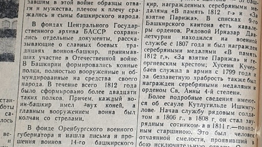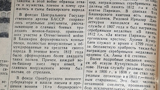 В Госархиве БАССР сохранились документы, рассказывающие о славных боевых традициях воинов-башкир, вместе с русским народом принимавших участие в Отечественной войне. По данным издания, в 1812 году в Башкирии было сформировано более двадцати конных полков, полностью вооруженных и обмундированных на средства своего народа. «Причем каждый воин-башкир имел двух коней, а главным вооружением воина был колчан со стрелами». В сентябре 1812 года - в месяц славной битвы под Бородино, уфимцы собрали на вооружение народного ополчения 1375 рублей пожертвований. Это большие деньги по тем временам.