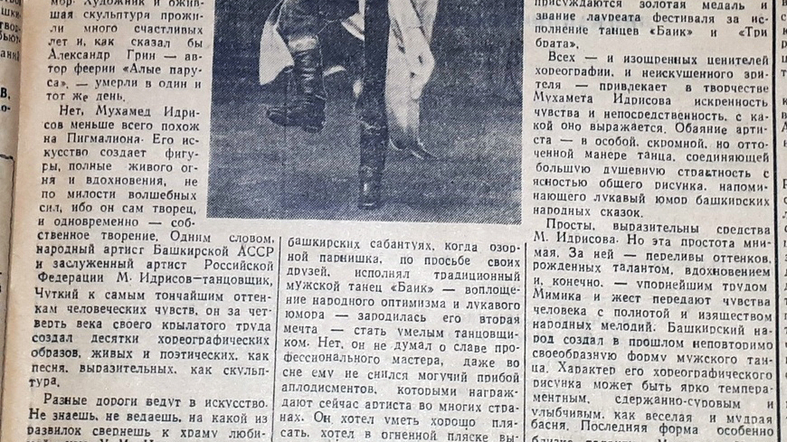 Мухамет Идрисов меньше всего похож на Пигмалиона, скульптора древней Эллады, в мраморное творение которого вдохнули жизнь сами боги Олимпа, как утверждает легенда. Нет, искусство Мухамета Идрисова «создает фигуры, полные живого огня и вдохновения, не по милости волшебных сил, ибо он сам творец, и одновременно – собственное творение», пишет газета. Народный артист Башкирской АССР и заслуженный артист Российской Федерации Мухамет Идрисов – танцовщик, за годы своего «крылатого труда он создал десятки хореографических образов, живых и поэтических, как песня, выразительных, как скульптура», говорится в публикации.