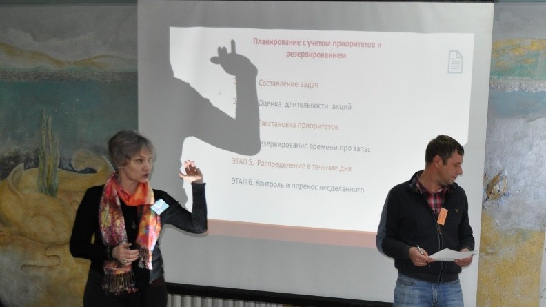 Тренеры рассказали слушателям, о том, как эффективная организация своего времени способствует достижению целей и развивает потенциал каждого человека. О том, как научиться определять истинные цели, отсекая второстепенные и неважные дела, о том, как важно планирование, как бороться с «поглотителями времени», какие бывают системы управления временем и еще очень много чего полезного и интересного.